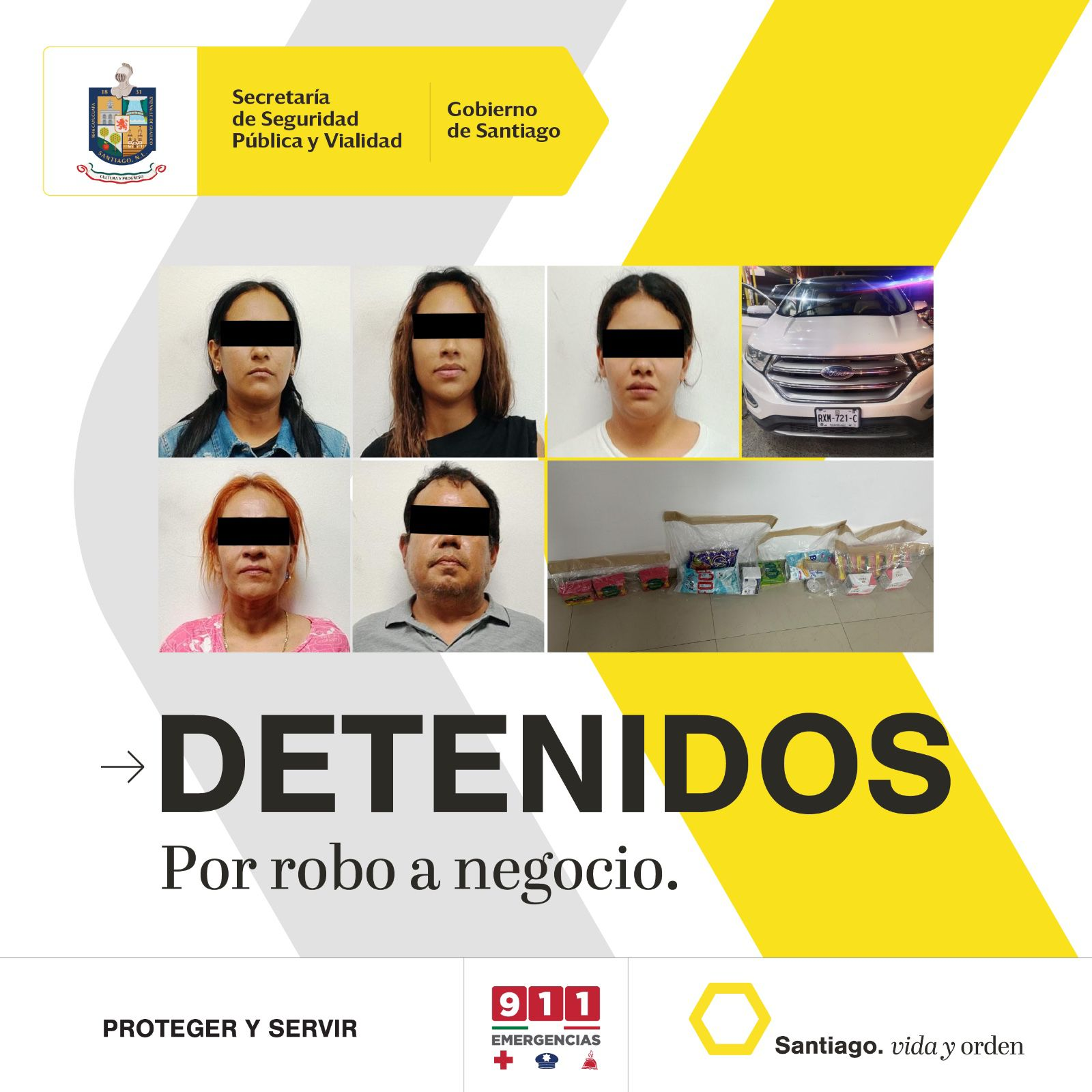Gracias al monitoreo del Centro de Inteligencia para la Vigilancia (CIV), elementos de la Policía de Santiago lograron la detención de una banda de farderos que había sustraído diversos productos de una farmacia en la comunidad de El Cercado. Los detenidos fueron identificados como Marco “N” (53 años), Violeta “N” (41), Karen “N” (31), Daniela “N” (27) y Leslie “N” (24), originarios de los municipios de Guadalupe y Monterrey. Tras robar artículos como **jabones, frituras, suavizantes y detergentes